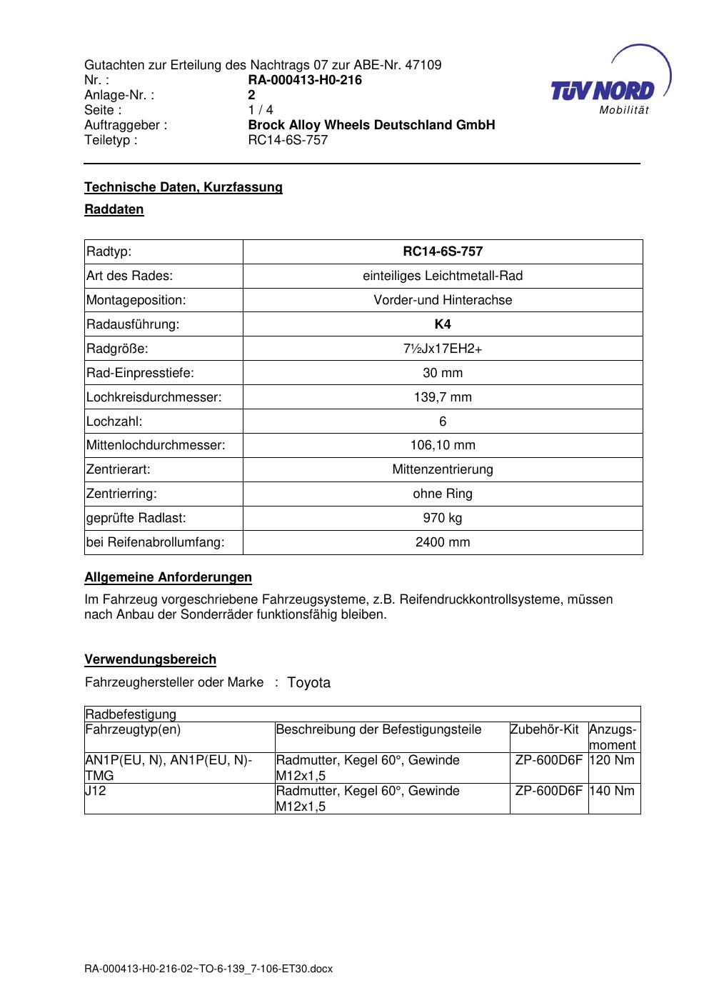 Dieses Gutachten (abe) bezieht sich auf die Alufelge Brock RC14 -6S-757 in der Ausführung ET 0, Mittenloch 0 mm (KBA 47109). Im PDF findest du typischerweise zulässige Reifengrößen, Auflagen/Anbauhinweise und – je nach Dokument – Hinweise zur Eintragung.