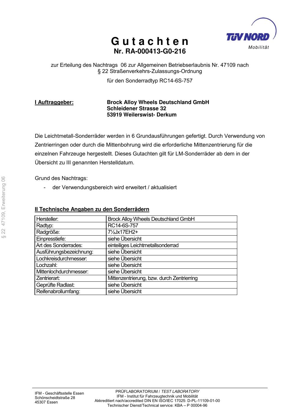 Dieses Gutachten (abe) bezieht sich auf die Alufelge Brock RC14 -6S-757 in der Ausführung ET 0, Mittenloch 0 mm (KBA 47109). Im PDF findest du typischerweise zulässige Reifengrößen, Auflagen/Anbauhinweise und – je nach Dokument – Hinweise zur Eintragung.