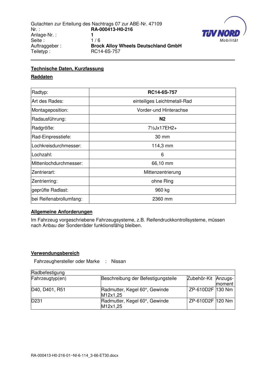Dieses Gutachten (abe) bezieht sich auf die Alufelge Brock RC14 -6S-757 in der Ausführung ET 0, Mittenloch 0 mm (KBA 47109). Im PDF findest du typischerweise zulässige Reifengrößen, Auflagen/Anbauhinweise und – je nach Dokument – Hinweise zur Eintragung.