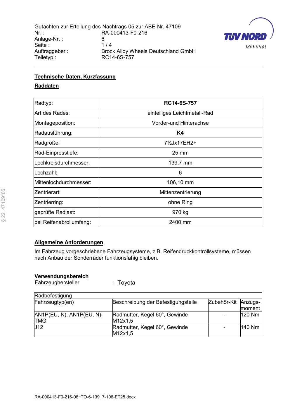 Dieses Gutachten (abe) bezieht sich auf die Alufelge Brock RC14 -6S-757 in der Ausführung ET 0, Mittenloch 0 mm (KBA 47109). Im PDF findest du typischerweise zulässige Reifengrößen, Auflagen/Anbauhinweise und – je nach Dokument – Hinweise zur Eintragung.