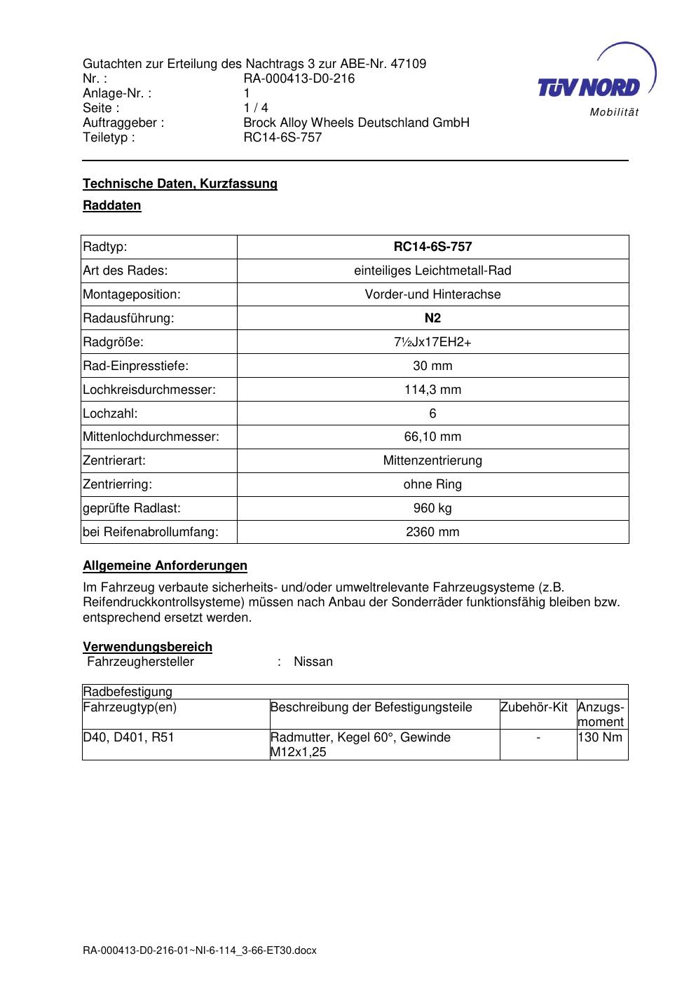 Dieses Gutachten (abe) bezieht sich auf die Alufelge Brock RC14 -6S-757 in der Ausführung ET 0, Mittenloch 0 mm (KBA 47109). Im PDF findest du typischerweise zulässige Reifengrößen, Auflagen/Anbauhinweise und – je nach Dokument – Hinweise zur Eintragung.