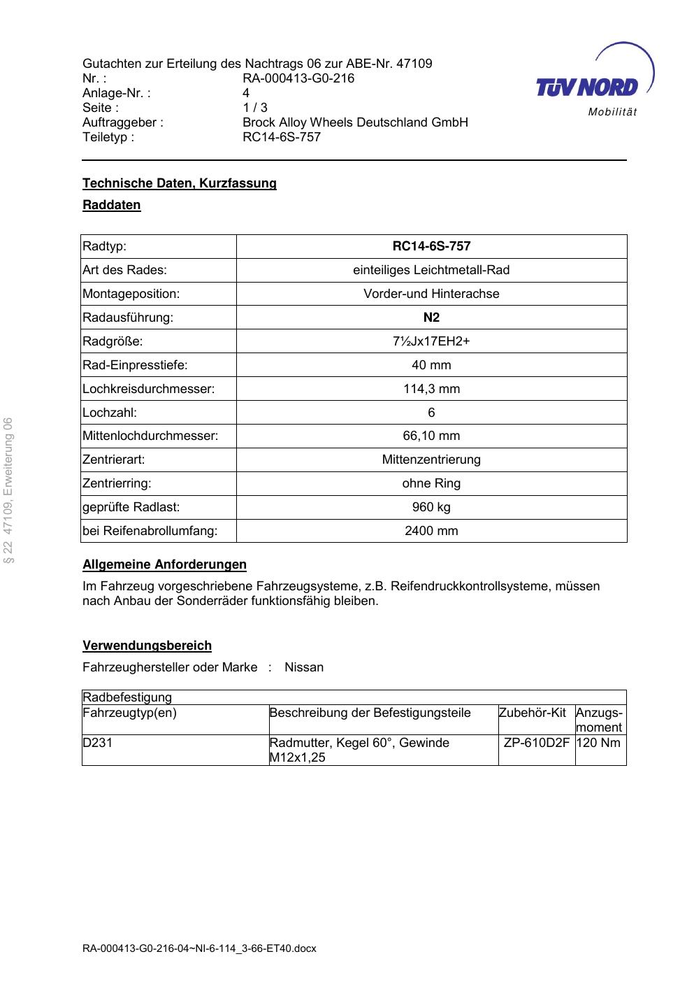 Dieses Gutachten (abe) bezieht sich auf die Alufelge Brock RC14 -6S-757 in der Ausführung ET 0, Mittenloch 0 mm (KBA 47109). Im PDF findest du typischerweise zulässige Reifengrößen, Auflagen/Anbauhinweise und – je nach Dokument – Hinweise zur Eintragung.