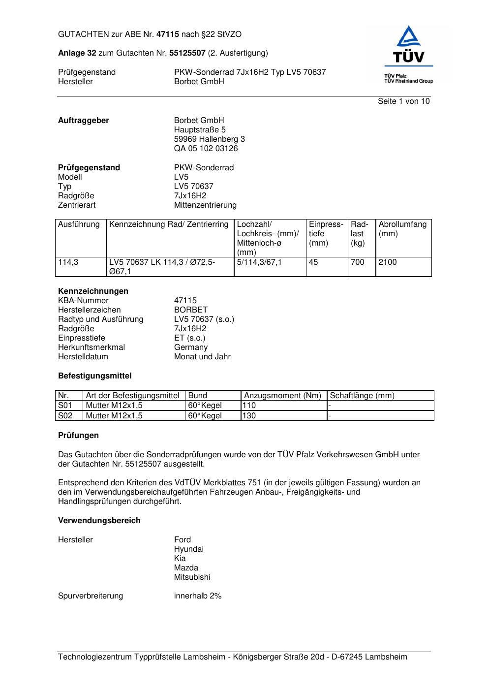 Dieses Gutachten (abe) bezieht sich auf die Alufelge Borbet LV5 70637 in der Ausführung 7Jx16 ET 0, Mittenloch 0 mm (KBA 47115). Im PDF findest du typischerweise zulässige Reifengrößen, Auflagen/Anbauhinweise und – je nach Dokument – Hinweise zur Eintragung.