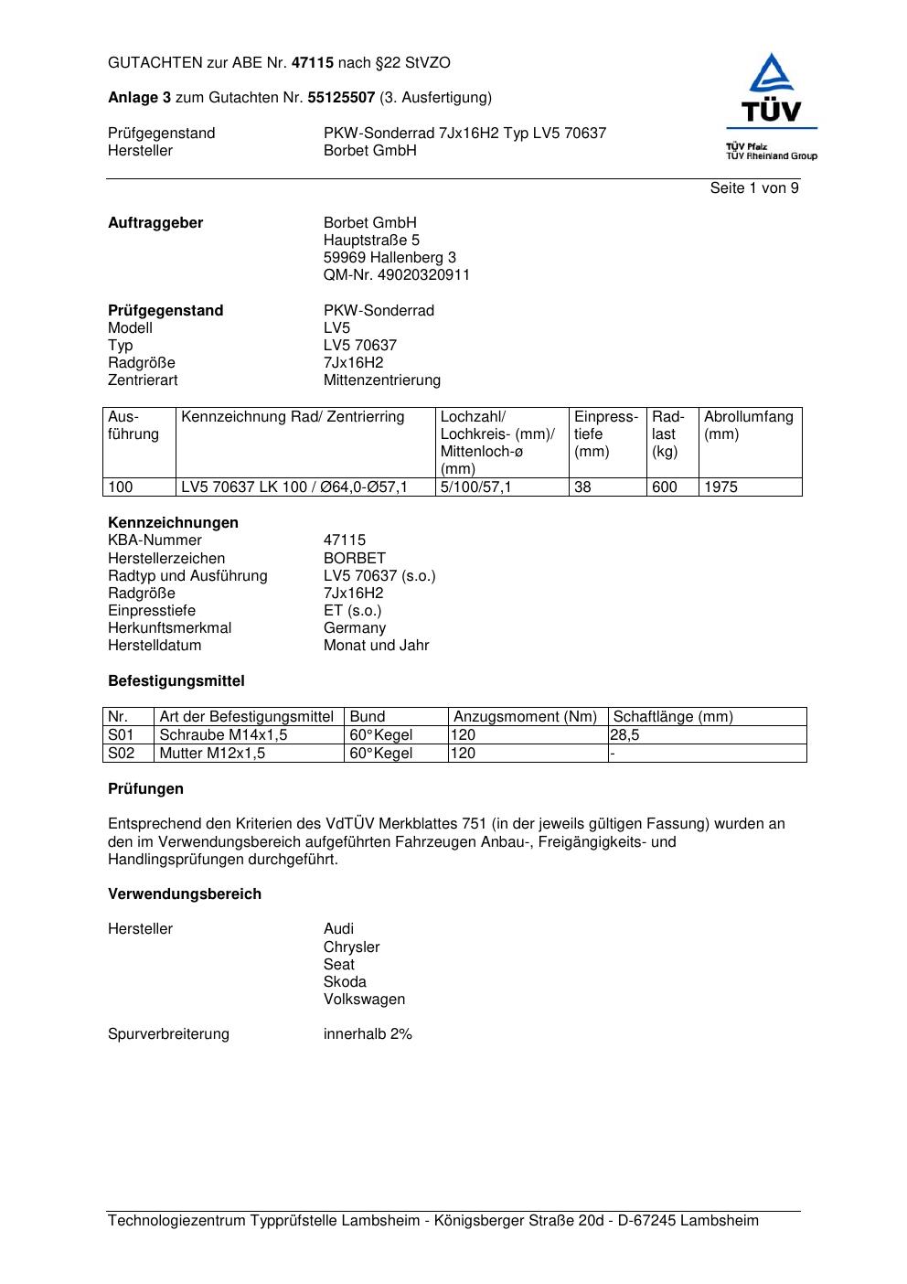 Dieses Gutachten (abe) bezieht sich auf die Alufelge Borbet LV5 70637 in der Ausführung 7Jx16 ET 0, Mittenloch 0 mm (KBA 47115). Im PDF findest du typischerweise zulässige Reifengrößen, Auflagen/Anbauhinweise und – je nach Dokument – Hinweise zur Eintragung.