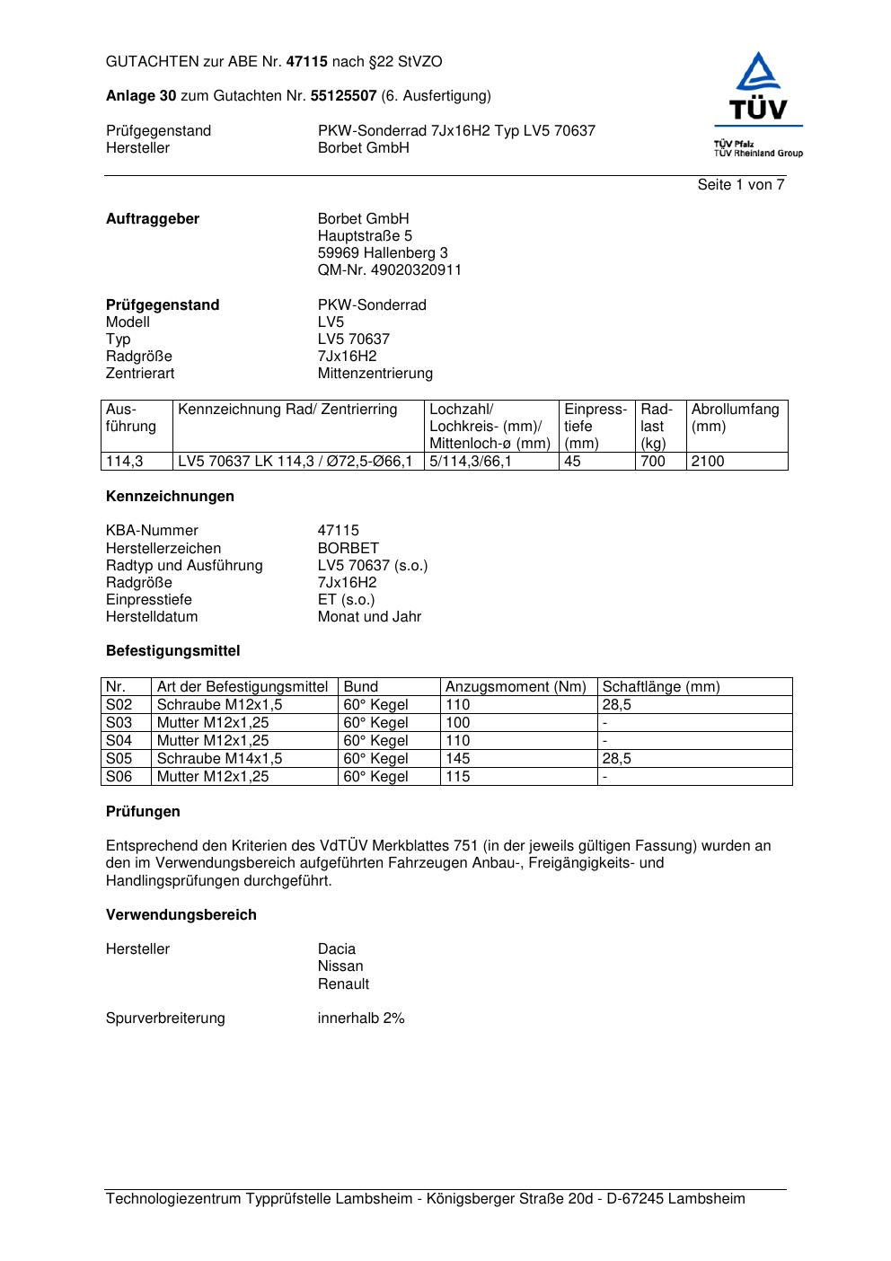 Dieses Gutachten (abe) bezieht sich auf die Alufelge Borbet LV5 70637 in der Ausführung 7Jx16 ET 0, Mittenloch 0 mm (KBA 47115). Im PDF findest du typischerweise zulässige Reifengrößen, Auflagen/Anbauhinweise und – je nach Dokument – Hinweise zur Eintragung.