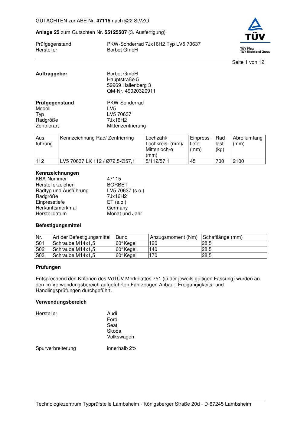 Dieses Gutachten (abe) bezieht sich auf die Alufelge Borbet LV5 70637 in der Ausführung 7Jx16 ET 0, Mittenloch 0 mm (KBA 47115). Im PDF findest du typischerweise zulässige Reifengrößen, Auflagen/Anbauhinweise und – je nach Dokument – Hinweise zur Eintragung.