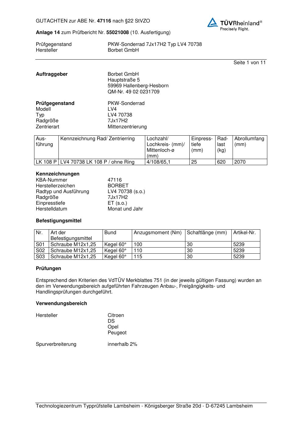 Dieses Gutachten (abe) bezieht sich auf die Alufelge Borbet LV4 70738 in der Ausführung 7Jx17 ET 0, Mittenloch 0 mm (KBA 47116). Im PDF findest du typischerweise zulässige Reifengrößen, Auflagen/Anbauhinweise und – je nach Dokument – Hinweise zur Eintragung.