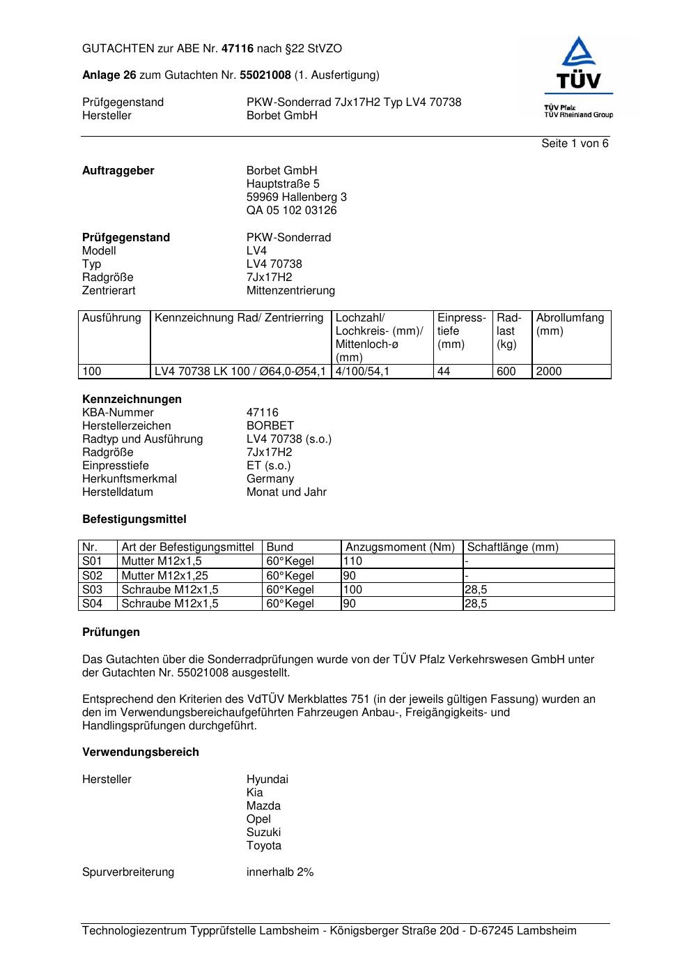 Dieses Gutachten (abe) bezieht sich auf die Alufelge Borbet LV4 70738 in der Ausführung 7Jx17 ET 0, Mittenloch 0 mm (KBA 47116). Im PDF findest du typischerweise zulässige Reifengrößen, Auflagen/Anbauhinweise und – je nach Dokument – Hinweise zur Eintragung.
