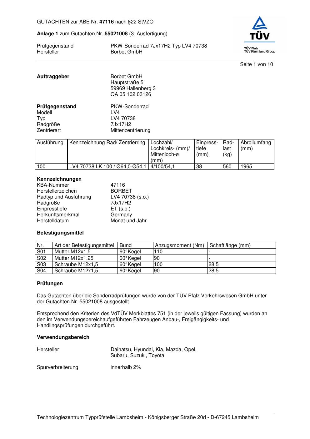 Dieses Gutachten (abe) bezieht sich auf die Alufelge Borbet LV4 70738 in der Ausführung 7Jx17 ET 0, Mittenloch 0 mm (KBA 47116). Im PDF findest du typischerweise zulässige Reifengrößen, Auflagen/Anbauhinweise und – je nach Dokument – Hinweise zur Eintragung.