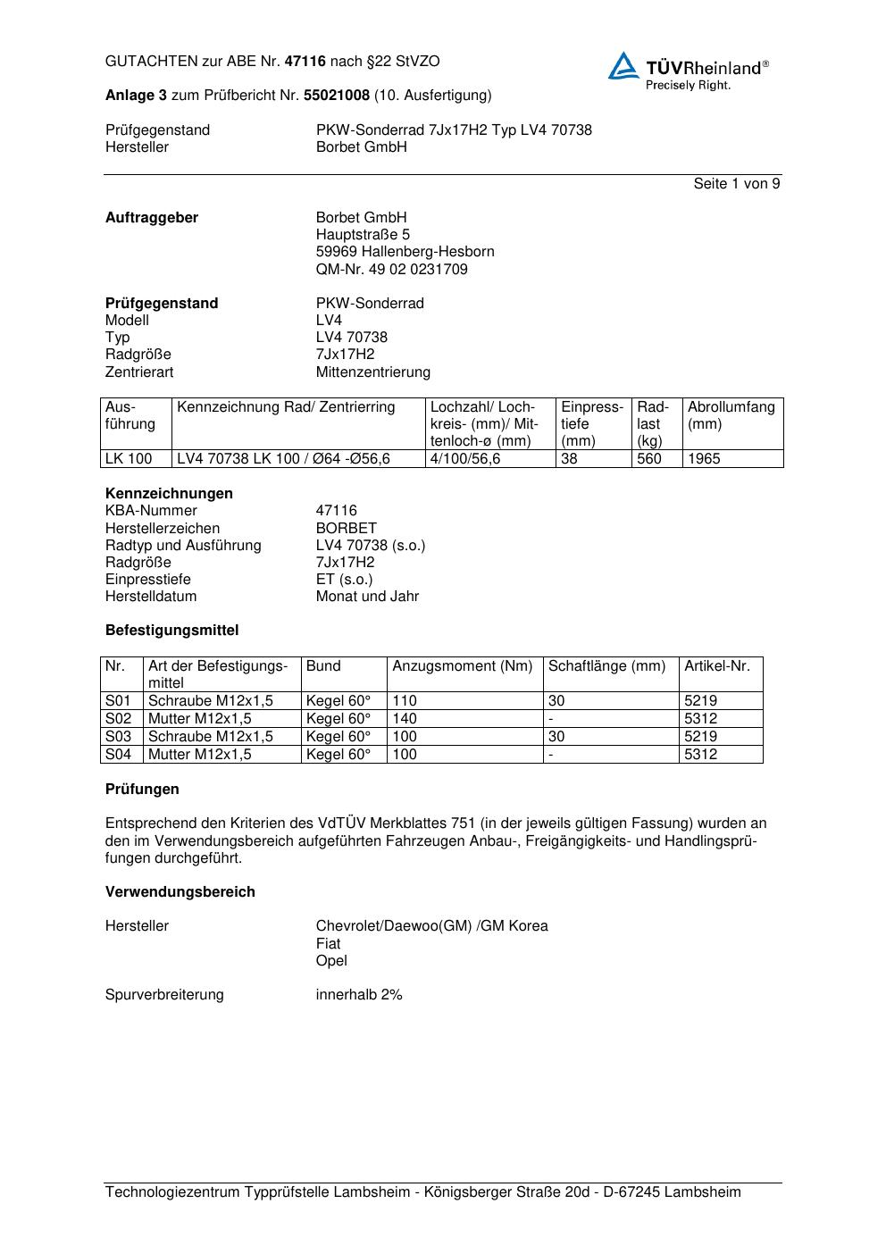 Dieses Gutachten (abe) bezieht sich auf die Alufelge Borbet LV4 70738 in der Ausführung 7Jx17 ET 0, Mittenloch 0 mm (KBA 47116). Im PDF findest du typischerweise zulässige Reifengrößen, Auflagen/Anbauhinweise und – je nach Dokument – Hinweise zur Eintragung.