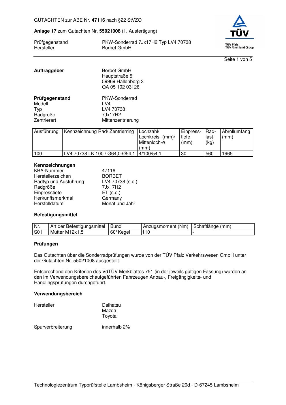 Dieses Gutachten (abe) bezieht sich auf die Alufelge Borbet LV4 70738 in der Ausführung 7Jx17 ET 0, Mittenloch 0 mm (KBA 47116). Im PDF findest du typischerweise zulässige Reifengrößen, Auflagen/Anbauhinweise und – je nach Dokument – Hinweise zur Eintragung.
