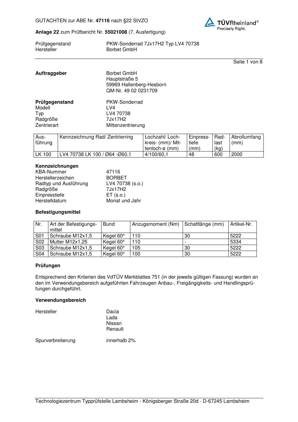 Dieses Gutachten (abe) bezieht sich auf die Alufelge Borbet LV4 70738 in der Ausführung 7Jx17 ET 0, Mittenloch 0 mm (KBA 47116). Im PDF findest du typischerweise zulässige Reifengrößen, Auflagen/Anbauhinweise und – je nach Dokument – Hinweise zur Eintragung.