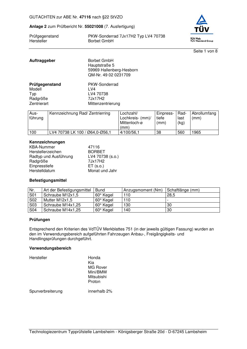 Dieses Gutachten (abe) bezieht sich auf die Alufelge Borbet LV4 70738 in der Ausführung 7Jx17 ET 0, Mittenloch 0 mm (KBA 47116). Im PDF findest du typischerweise zulässige Reifengrößen, Auflagen/Anbauhinweise und – je nach Dokument – Hinweise zur Eintragung.