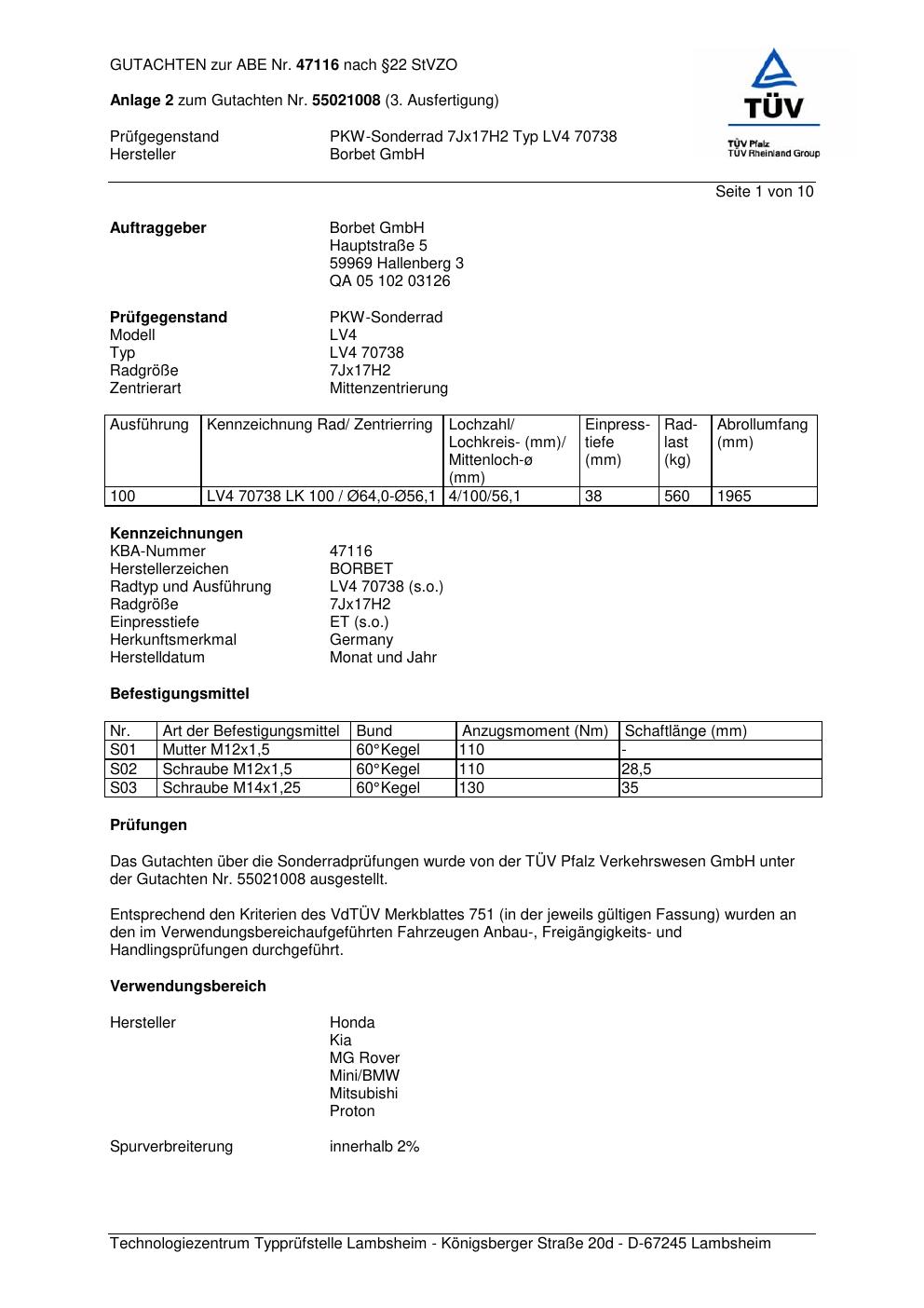 Dieses Gutachten (abe) bezieht sich auf die Alufelge Borbet LV4 70738 in der Ausführung 7Jx17 ET 0, Mittenloch 0 mm (KBA 47116). Im PDF findest du typischerweise zulässige Reifengrößen, Auflagen/Anbauhinweise und – je nach Dokument – Hinweise zur Eintragung.