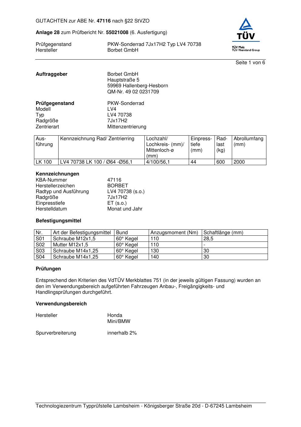 Dieses Gutachten (abe) bezieht sich auf die Alufelge Borbet LV4 70738 in der Ausführung 7Jx17 ET 0, Mittenloch 0 mm (KBA 47116). Im PDF findest du typischerweise zulässige Reifengrößen, Auflagen/Anbauhinweise und – je nach Dokument – Hinweise zur Eintragung.