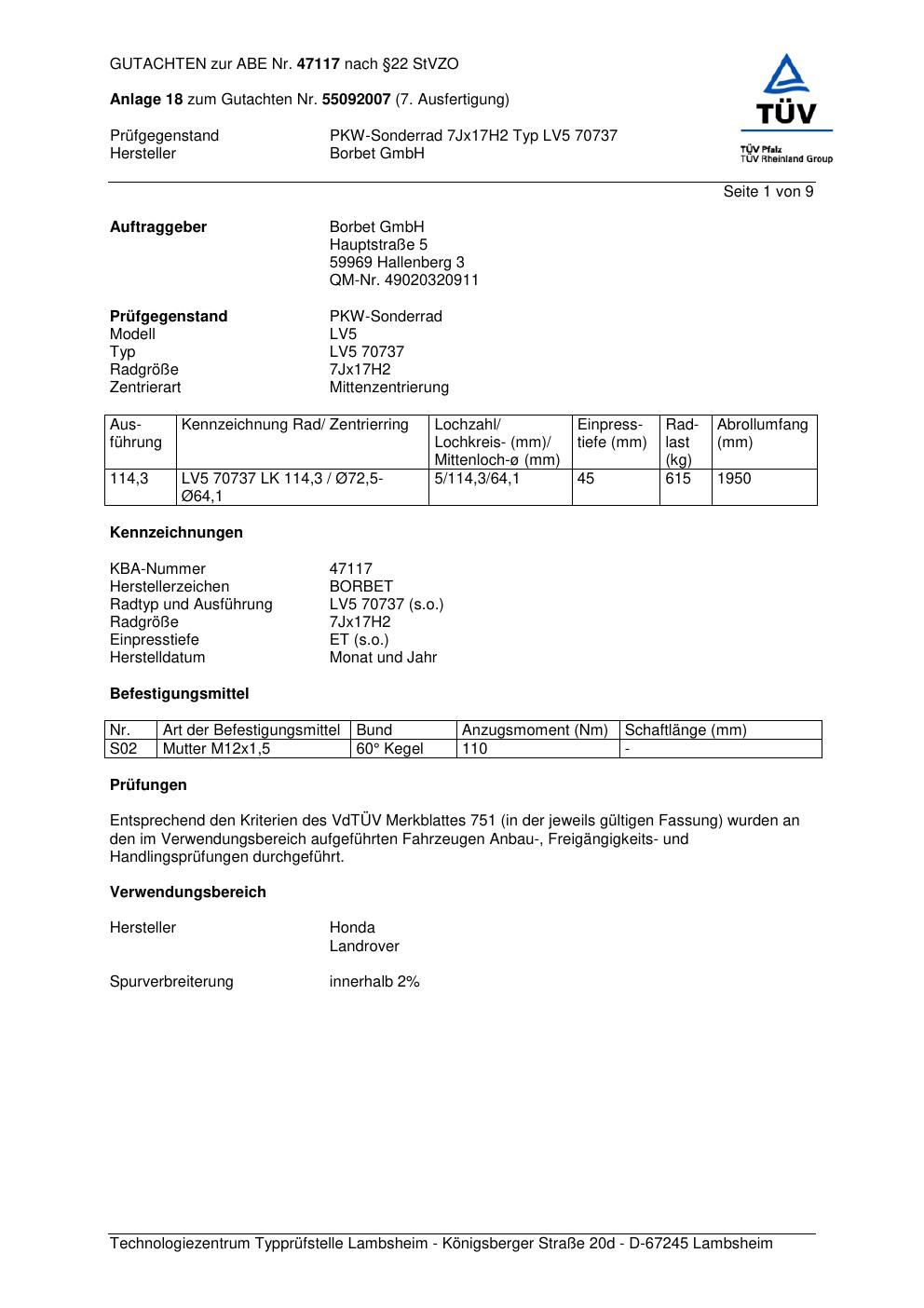 Dieses Gutachten (abe) bezieht sich auf die Alufelge Borbet LV5 70737 in der Ausführung 7Jx17 ET 0, Mittenloch 0 mm (KBA 47117). Im PDF findest du typischerweise zulässige Reifengrößen, Auflagen/Anbauhinweise und – je nach Dokument – Hinweise zur Eintragung.