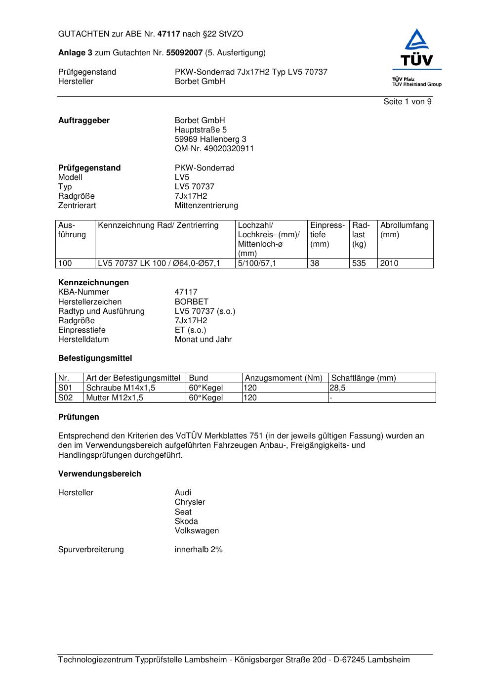 Dieses Gutachten (abe) bezieht sich auf die Alufelge Borbet LV5 70737 in der Ausführung 7Jx17 ET 0, Mittenloch 0 mm (KBA 47117). Im PDF findest du typischerweise zulässige Reifengrößen, Auflagen/Anbauhinweise und – je nach Dokument – Hinweise zur Eintragung.