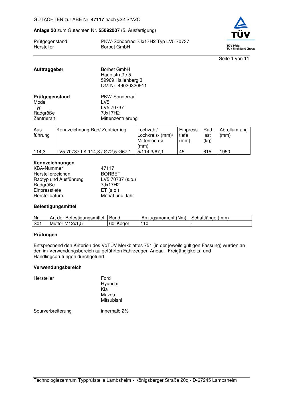 Dieses Gutachten (abe) bezieht sich auf die Alufelge Borbet LV5 70737 in der Ausführung 7Jx17 ET 0, Mittenloch 0 mm (KBA 47117). Im PDF findest du typischerweise zulässige Reifengrößen, Auflagen/Anbauhinweise und – je nach Dokument – Hinweise zur Eintragung.