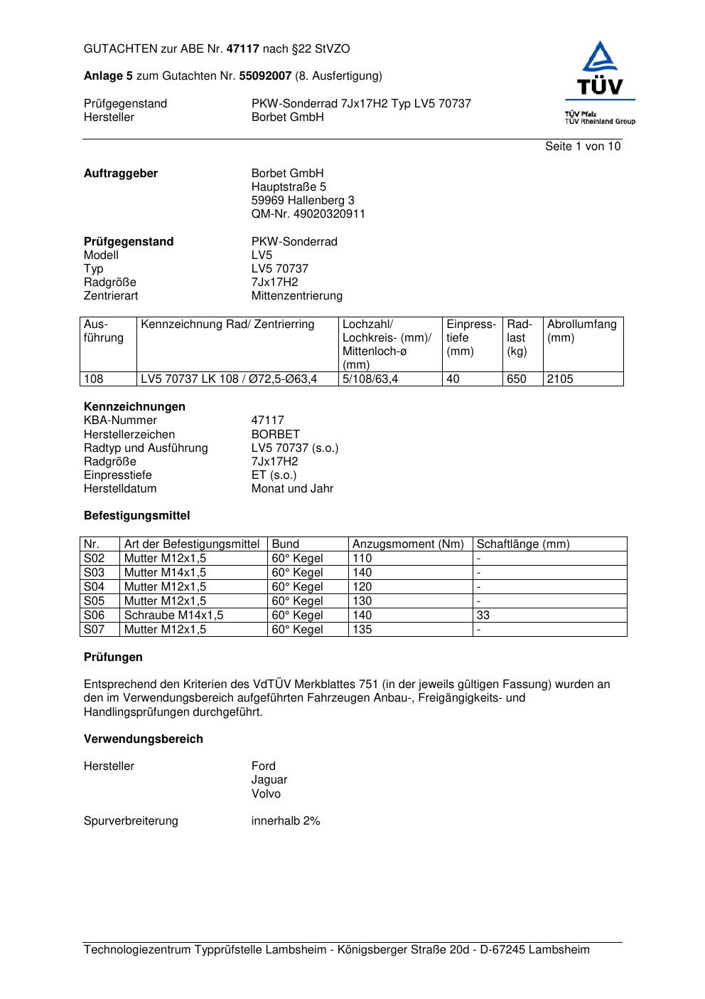 Dieses Gutachten (abe) bezieht sich auf die Alufelge Borbet LV5 70737 in der Ausführung 7Jx17 ET 0, Mittenloch 0 mm (KBA 47117). Im PDF findest du typischerweise zulässige Reifengrößen, Auflagen/Anbauhinweise und – je nach Dokument – Hinweise zur Eintragung.
