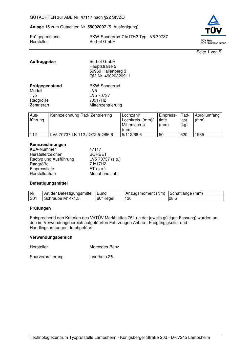 Dieses Gutachten (abe) bezieht sich auf die Alufelge Borbet LV5 70737 in der Ausführung 7Jx17 ET 0, Mittenloch 0 mm (KBA 47117). Im PDF findest du typischerweise zulässige Reifengrößen, Auflagen/Anbauhinweise und – je nach Dokument – Hinweise zur Eintragung.
