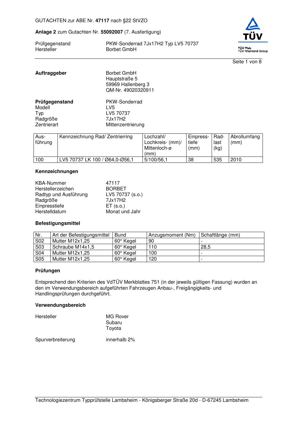 Dieses Gutachten (abe) bezieht sich auf die Alufelge Borbet LV5 70737 in der Ausführung 7Jx17 ET 0, Mittenloch 0 mm (KBA 47117). Im PDF findest du typischerweise zulässige Reifengrößen, Auflagen/Anbauhinweise und – je nach Dokument – Hinweise zur Eintragung.