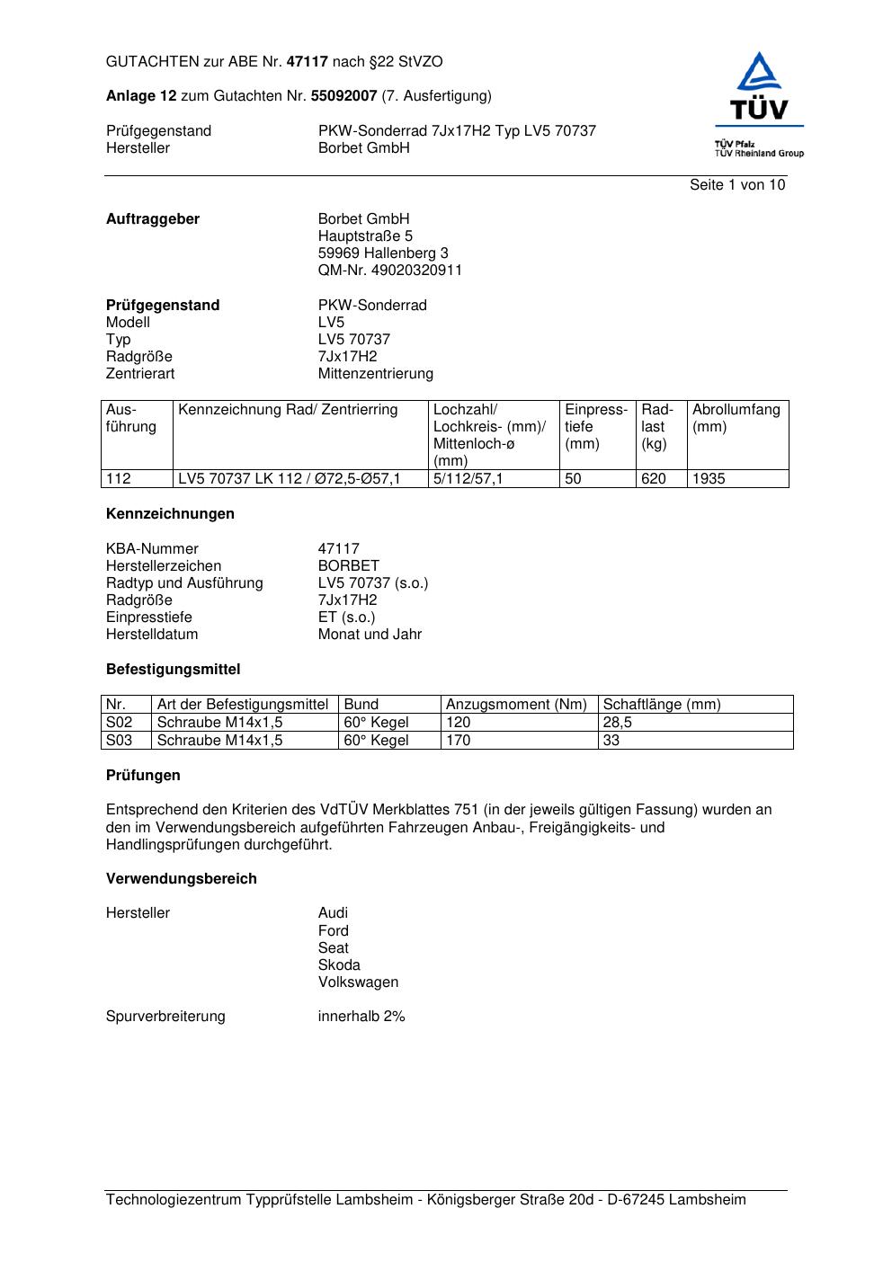 Dieses Gutachten (abe) bezieht sich auf die Alufelge Borbet LV5 70737 in der Ausführung 7Jx17 ET 0, Mittenloch 0 mm (KBA 47117). Im PDF findest du typischerweise zulässige Reifengrößen, Auflagen/Anbauhinweise und – je nach Dokument – Hinweise zur Eintragung.