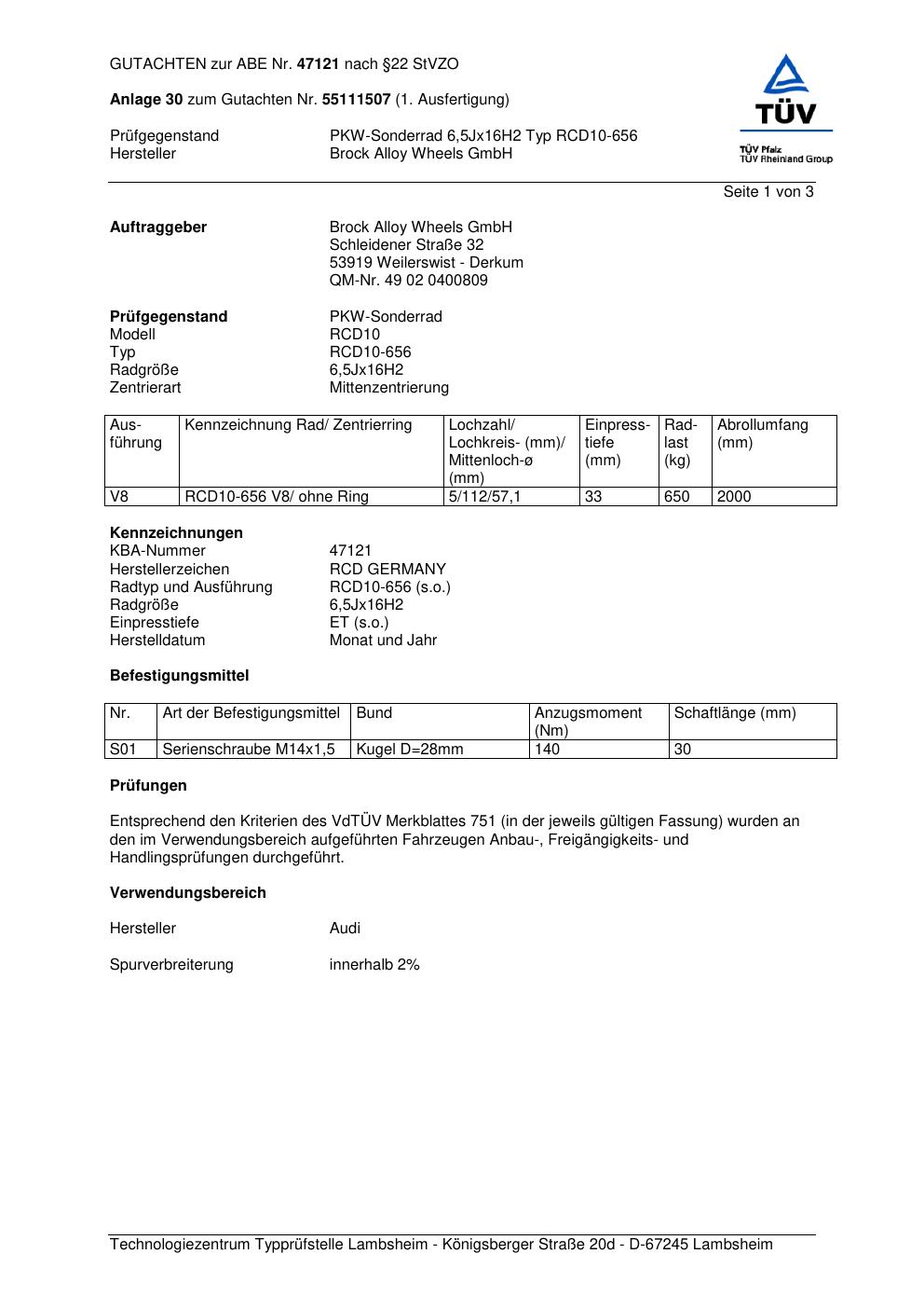 Felgengutachten / abe für Alufelgen Brock RCD10-65 6 (6.5Jx16 ET 0, Mittenloch 0 mm) mit KBA 47121 (Zertifikatsnummer 47121). Hier kostenlos als PDF herunterladen. Der Download-Link ist 24 Stunden gültig und kann bis zu zwei Mal verwendet werden.