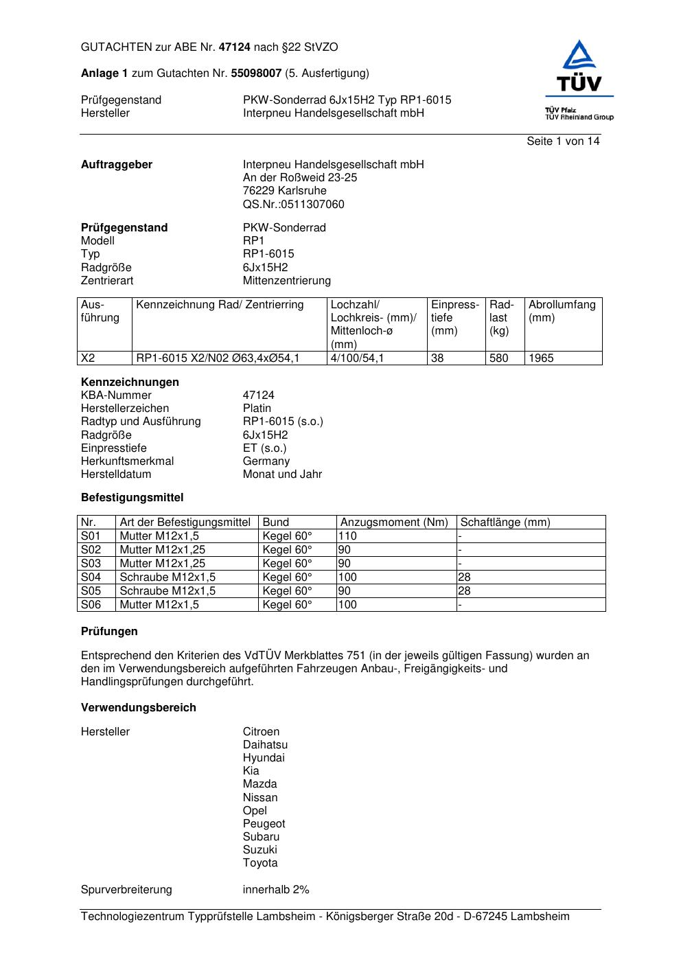 Dieses abe gehört zur Felge Platin RP1-6015 in 6Jx15 ET0 mit KBA 47124. Die Seite ist dafür gedacht, dass du schnell prüfen kannst, ob KBA, Design und Größe zu deiner Felge passen und danach direkt das richtige PDF lädst.