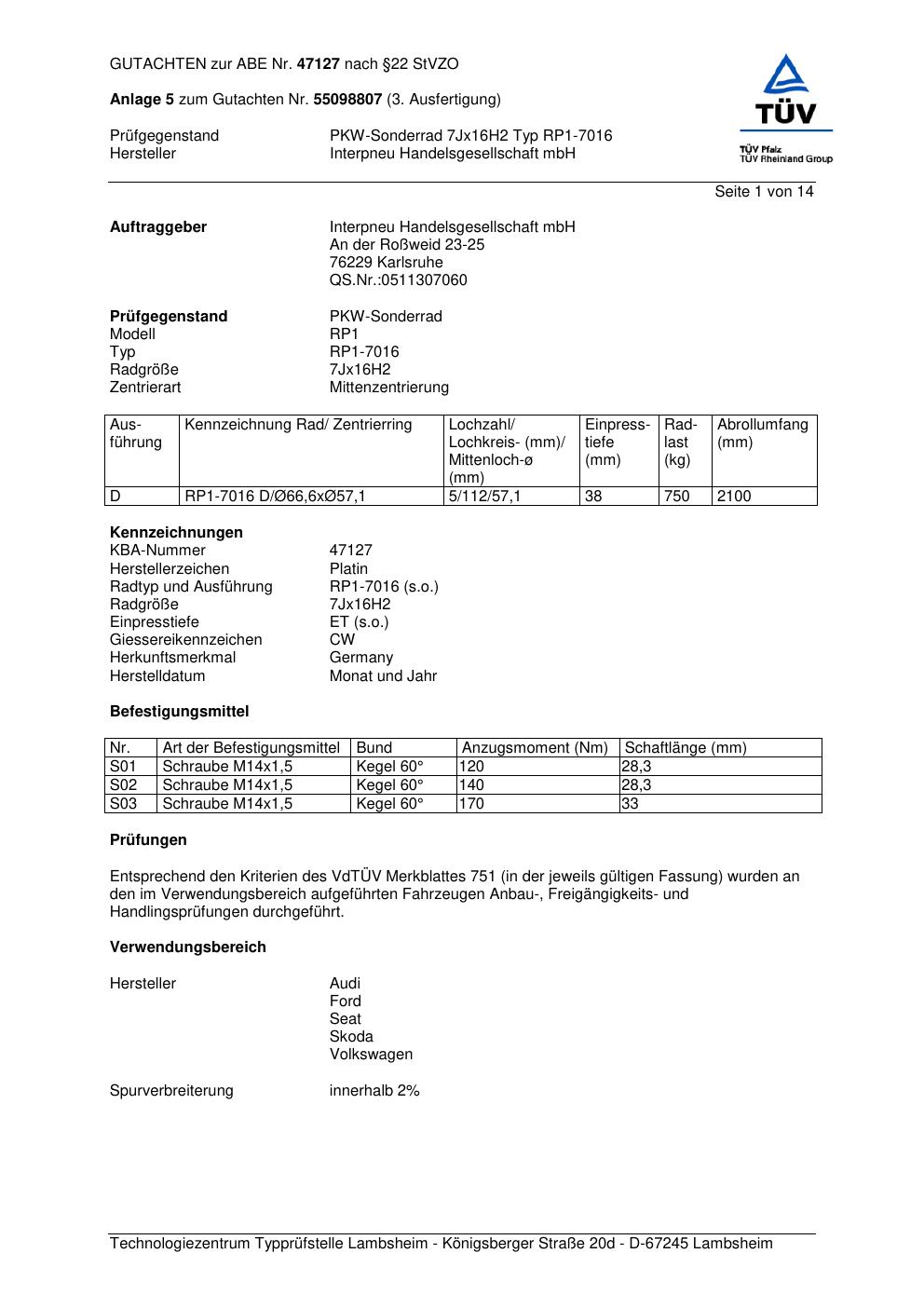Felgengutachten / abe für Alufelgen Platin RP1-7016 (7Jx16 ET 0, Mittenloch 0 mm) mit KBA 47127 (Zertifikatsnummer 47127). Hier kostenlos als PDF herunterladen. Der Download-Link ist 24 Stunden gültig und kann bis zu zwei Mal verwendet werden.