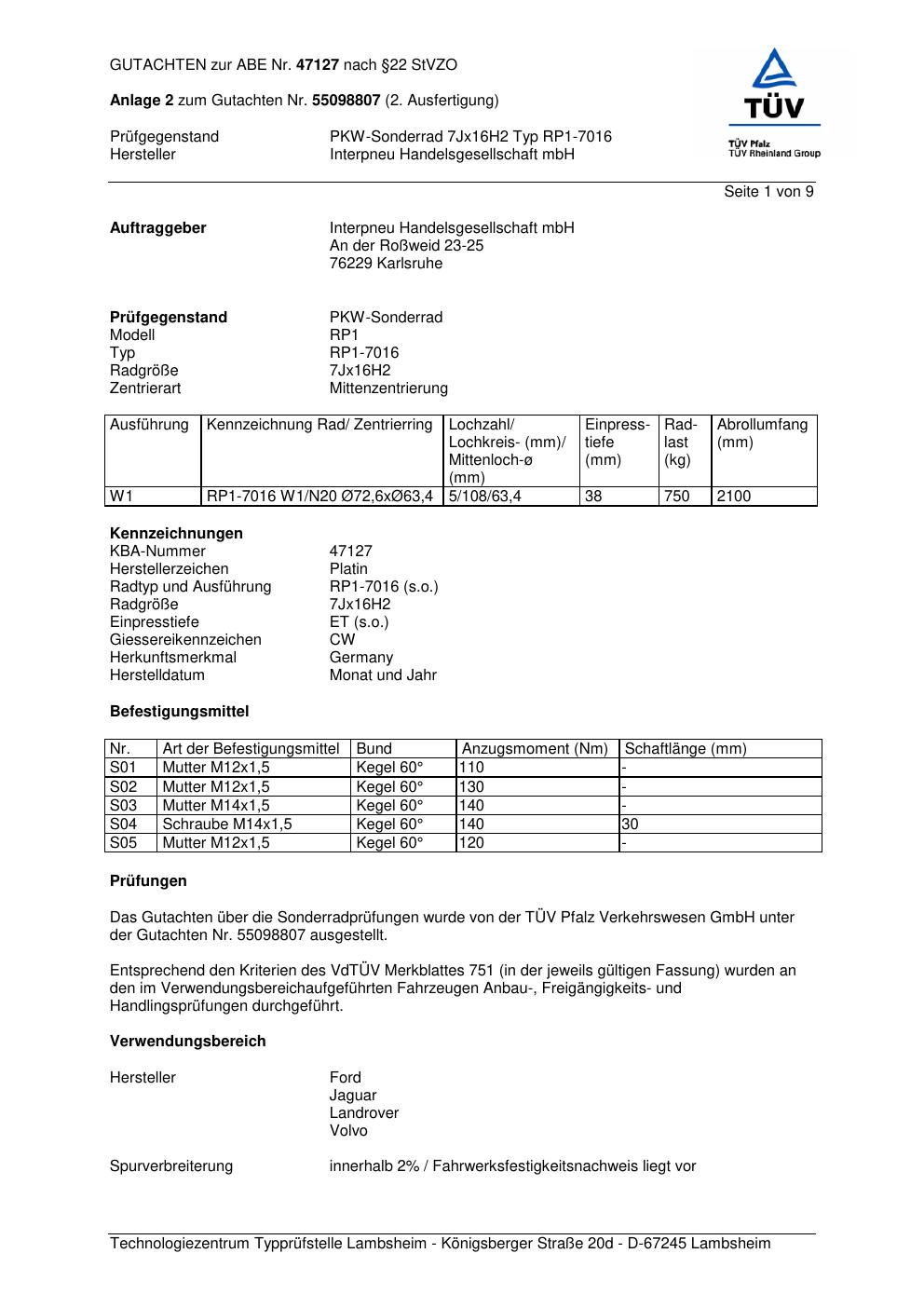 Dieses Gutachten (abe) bezieht sich auf die Alufelge Platin RP1-7016 in der Ausführung 7Jx16 ET 0, Mittenloch 0 mm (KBA 47127). Im PDF findest du typischerweise zulässige Reifengrößen, Auflagen/Anbauhinweise und – je nach Dokument – Hinweise zur Eintragung.