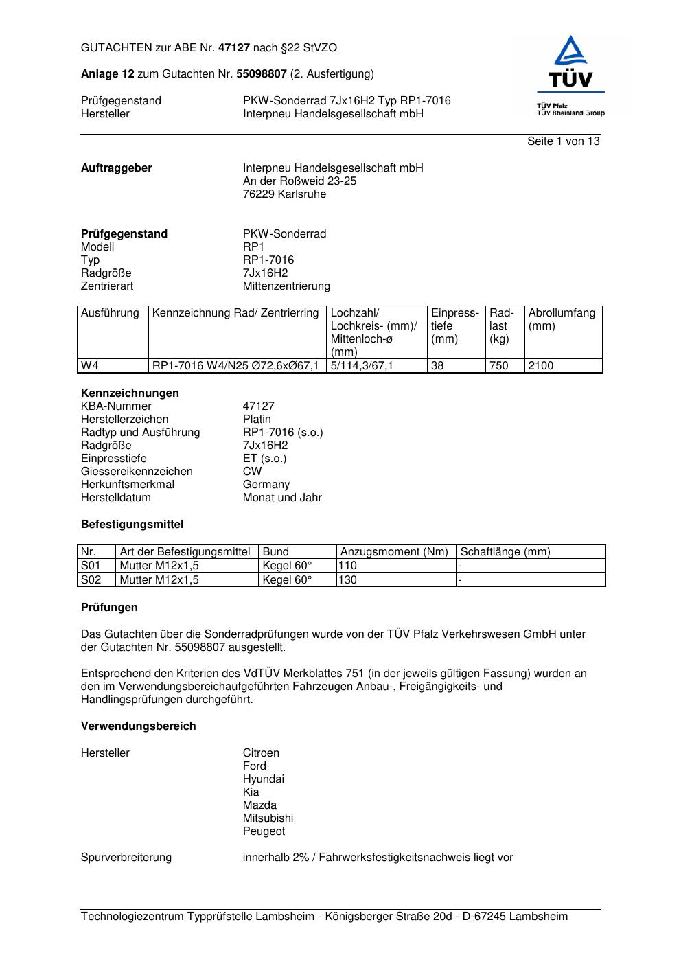 Dieses Gutachten (abe) bezieht sich auf die Alufelge Platin RP1-7016 in der Ausführung 7Jx16 ET 0, Mittenloch 0 mm (KBA 47127). Im PDF findest du typischerweise zulässige Reifengrößen, Auflagen/Anbauhinweise und – je nach Dokument – Hinweise zur Eintragung.