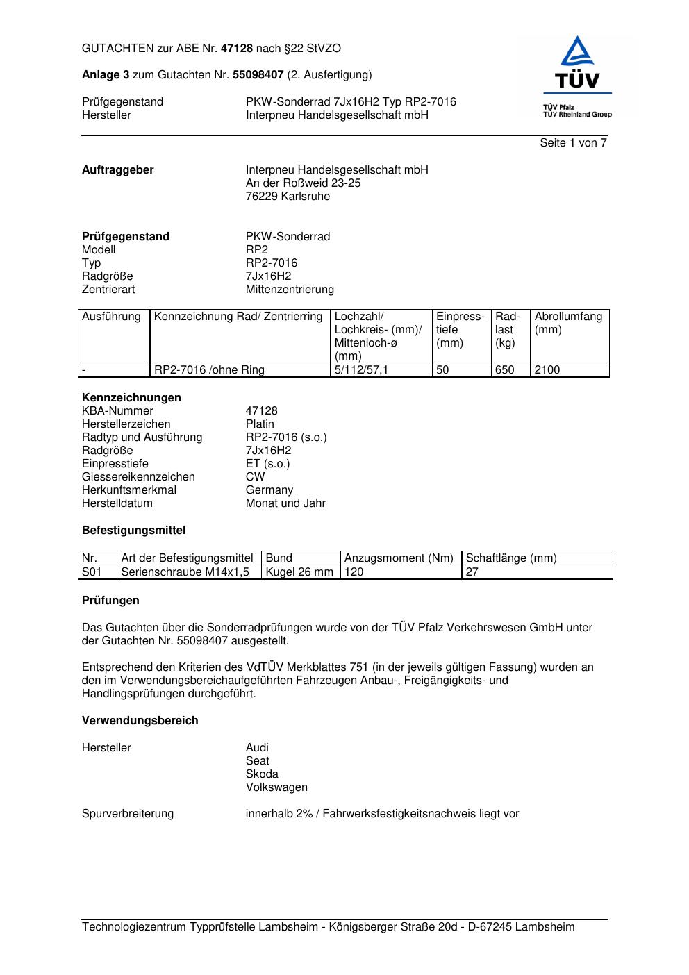 Felgengutachten / abe für Alufelgen Platin RP2-7016 (7Jx16 ET 0, Mittenloch 0 mm) mit KBA 47128 (Zertifikatsnummer 47128). Hier kostenlos als PDF herunterladen. Der Download-Link ist 24 Stunden gültig und kann bis zu zwei Mal verwendet werden.