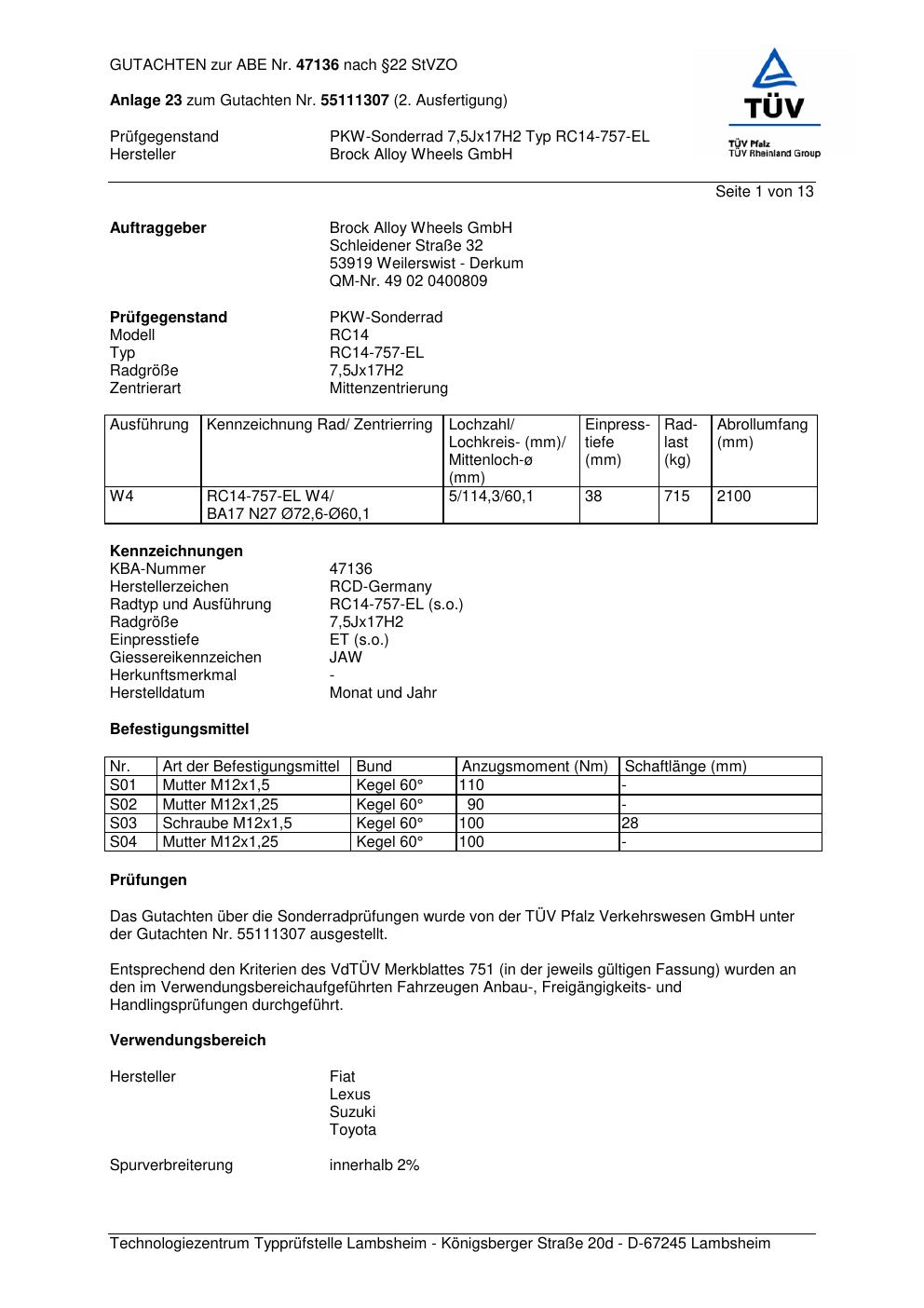 Dieses Gutachten (abe) bezieht sich auf die Alufelge Brock RC14-757 -EL in der Ausführung 7.5Jx17 ET 0, Mittenloch 0 mm (KBA 47136). Im PDF findest du typischerweise zulässige Reifengrößen, Auflagen/Anbauhinweise und – je nach Dokument – Hinweise zur Eintragung.