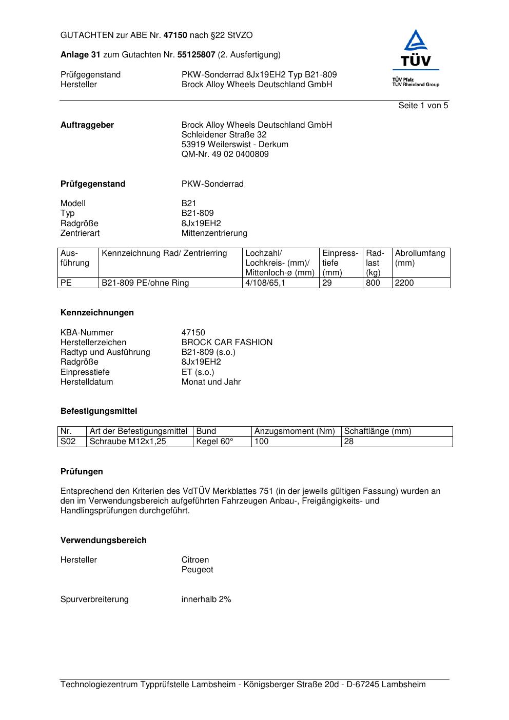 Dieses Gutachten (abe) bezieht sich auf die Alufelge Brock B21-809 in der Ausführung 8Jx19 ET 0, Mittenloch 0 mm (KBA 47150). Im PDF findest du typischerweise zulässige Reifengrößen, Auflagen/Anbauhinweise und – je nach Dokument – Hinweise zur Eintragung.