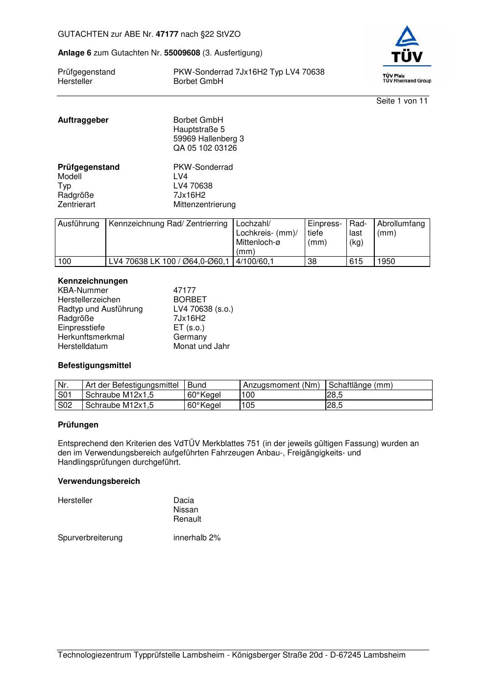 Dieses Gutachten (abe) bezieht sich auf die Alufelge Borbet LV4 70638 in der Ausführung 7Jx16 ET 0, Mittenloch 0 mm (KBA 47177). Im PDF findest du typischerweise zulässige Reifengrößen, Auflagen/Anbauhinweise und – je nach Dokument – Hinweise zur Eintragung.