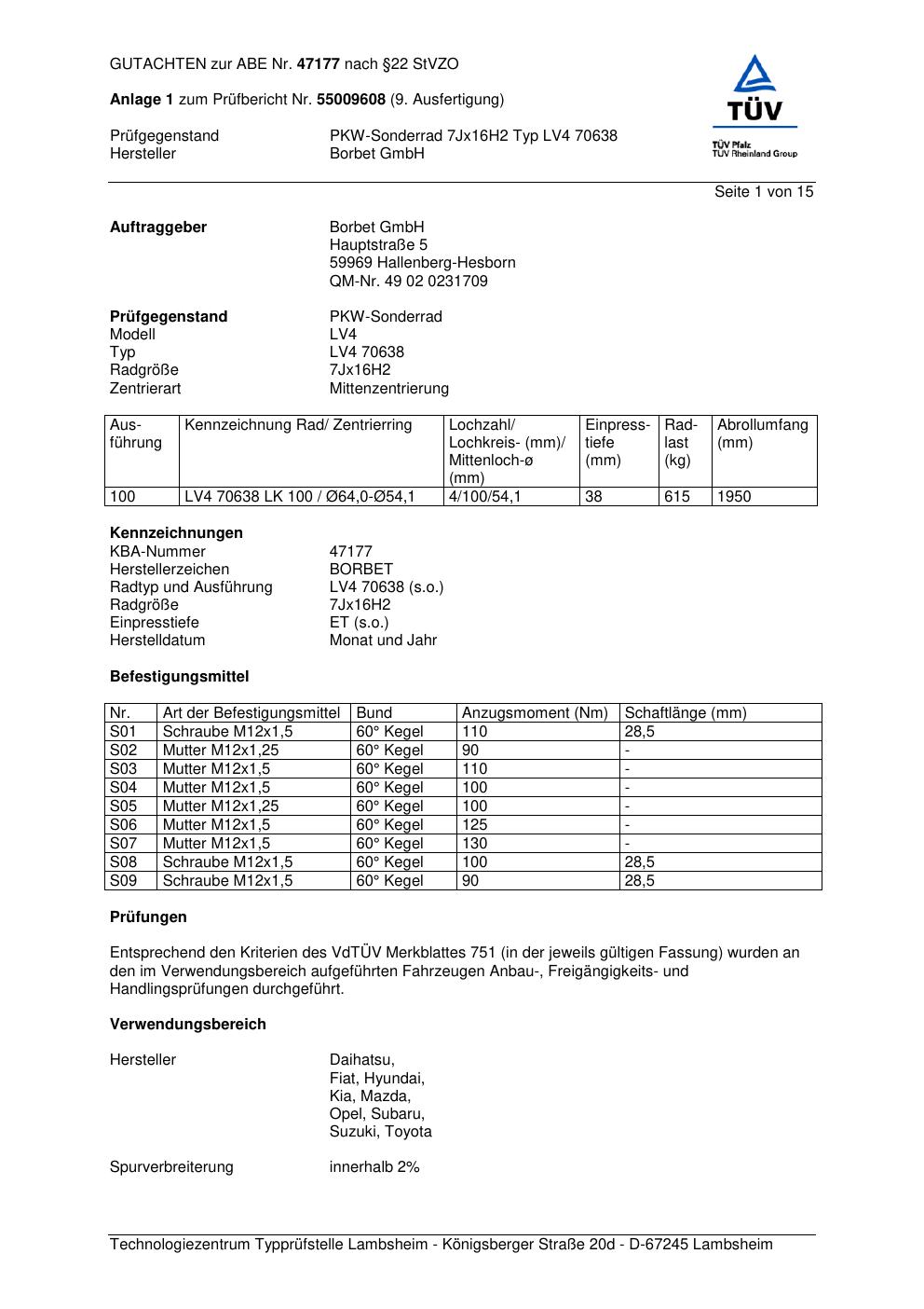 Dieses Gutachten (abe) bezieht sich auf die Alufelge Borbet LV4 70638 in der Ausführung 7Jx16 ET 0, Mittenloch 0 mm (KBA 47177). Im PDF findest du typischerweise zulässige Reifengrößen, Auflagen/Anbauhinweise und – je nach Dokument – Hinweise zur Eintragung.