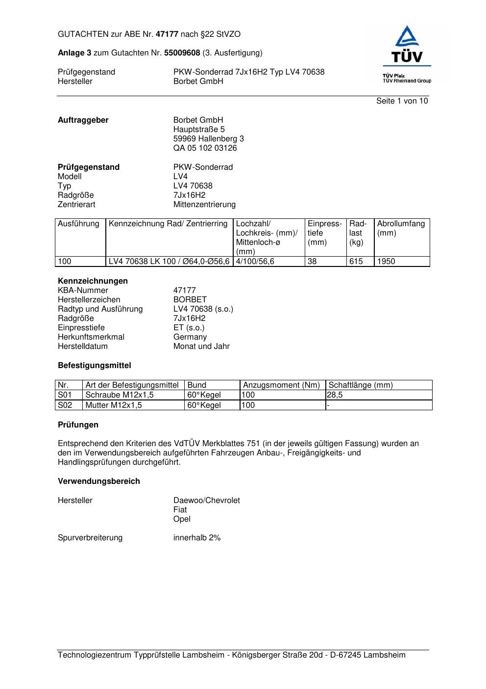 Dieses Gutachten (abe) bezieht sich auf die Alufelge Borbet LV4 70638 in der Ausführung 7Jx16 ET 0, Mittenloch 0 mm (KBA 47177). Im PDF findest du typischerweise zulässige Reifengrößen, Auflagen/Anbauhinweise und – je nach Dokument – Hinweise zur Eintragung.
