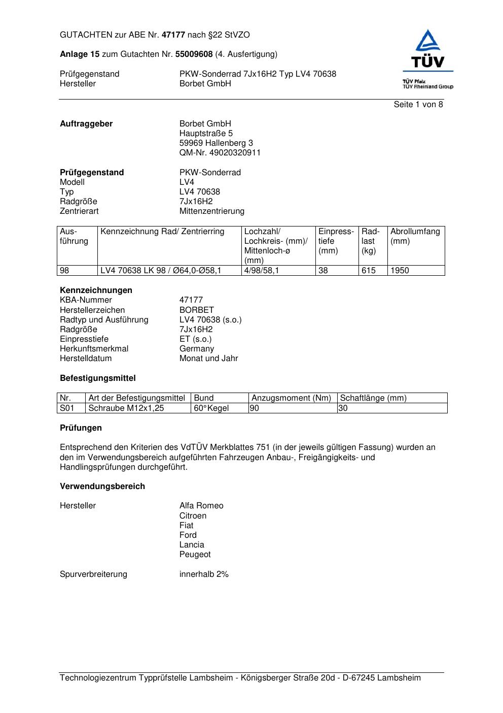 Dieses Gutachten (abe) bezieht sich auf die Alufelge Borbet LV4 70638 in der Ausführung 7Jx16 ET 0, Mittenloch 0 mm (KBA 47177). Im PDF findest du typischerweise zulässige Reifengrößen, Auflagen/Anbauhinweise und – je nach Dokument – Hinweise zur Eintragung.