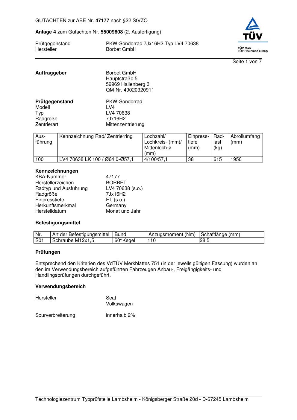 Dieses Gutachten (abe) bezieht sich auf die Alufelge Borbet LV4 70638 in der Ausführung 7Jx16 ET 0, Mittenloch 0 mm (KBA 47177). Im PDF findest du typischerweise zulässige Reifengrößen, Auflagen/Anbauhinweise und – je nach Dokument – Hinweise zur Eintragung.