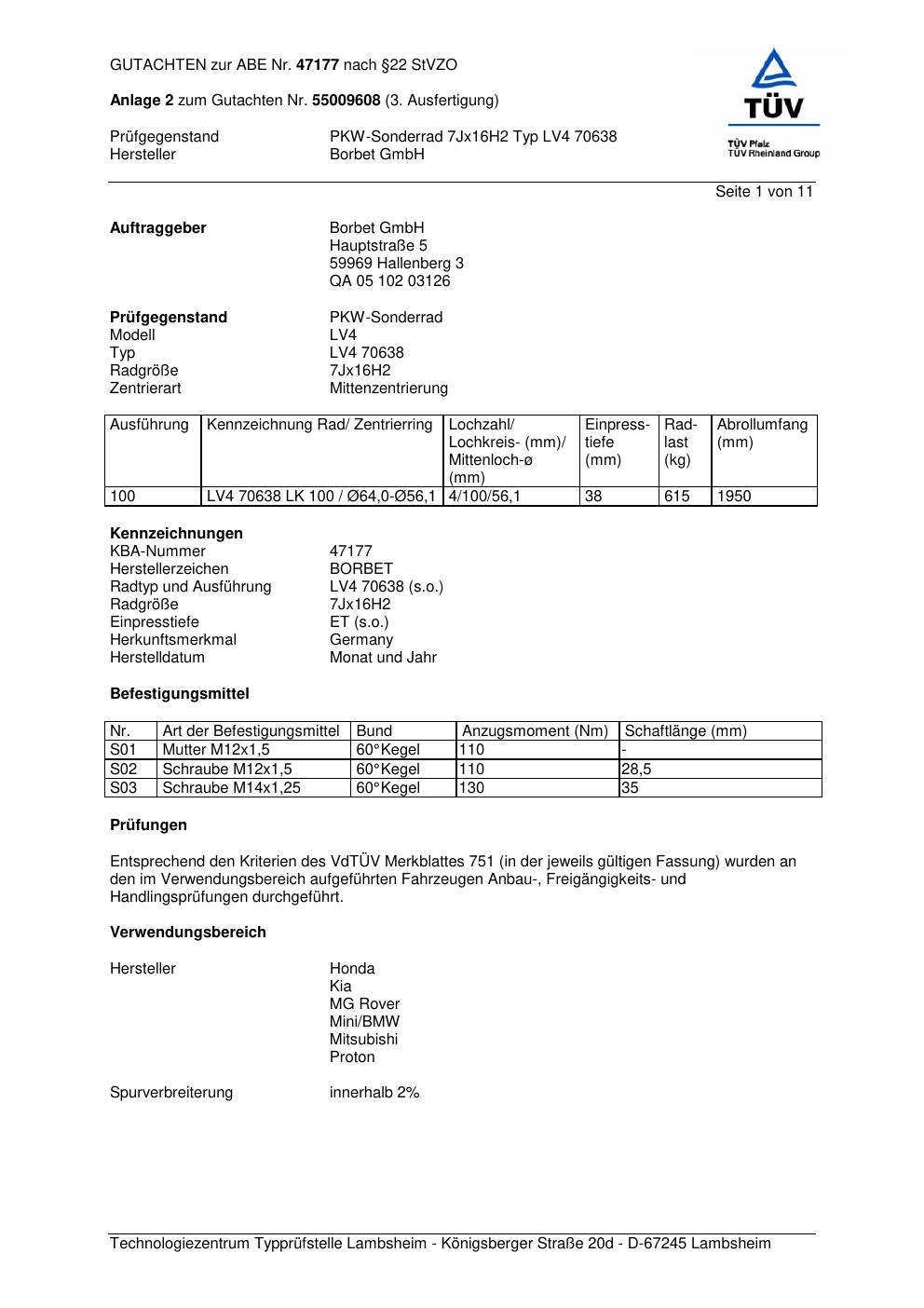 Dieses Gutachten (abe) bezieht sich auf die Alufelge Borbet LV4 70638 in der Ausführung 7Jx16 ET 0, Mittenloch 0 mm (KBA 47177). Im PDF findest du typischerweise zulässige Reifengrößen, Auflagen/Anbauhinweise und – je nach Dokument – Hinweise zur Eintragung.