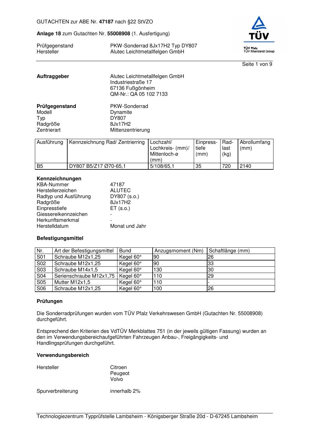 Dieses Gutachten (abe) bezieht sich auf die Alufelge ALUTEC DY807 in der Ausführung 8Jx17 ET 0, Mittenloch 0 mm (KBA 47187). Im PDF findest du typischerweise zulässige Reifengrößen, Auflagen/Anbauhinweise und – je nach Dokument – Hinweise zur Eintragung.