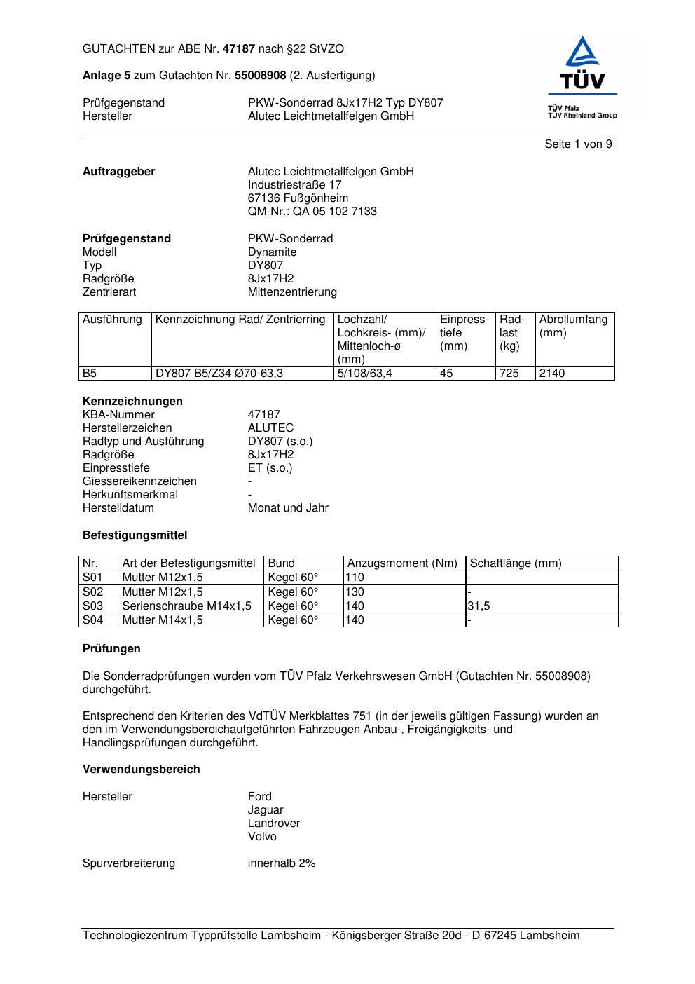 Dieses Gutachten (abe) bezieht sich auf die Alufelge ALUTEC DY807 in der Ausführung 8Jx17 ET 0, Mittenloch 0 mm (KBA 47187). Im PDF findest du typischerweise zulässige Reifengrößen, Auflagen/Anbauhinweise und – je nach Dokument – Hinweise zur Eintragung.