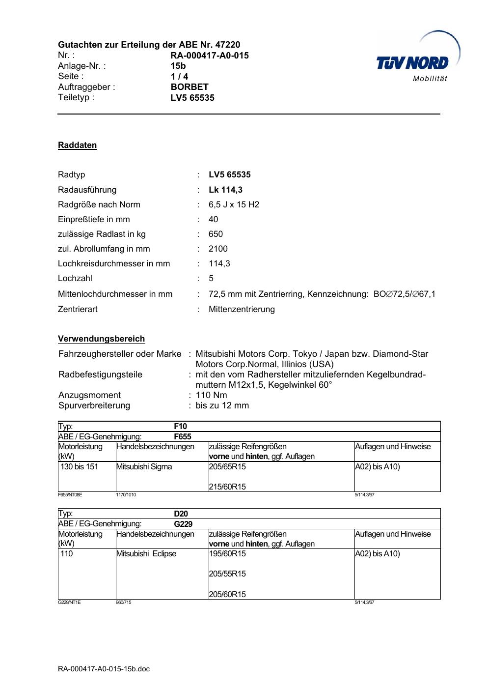 Dieses Gutachten (abe) bezieht sich auf die Alufelge Borbet LV5 65535 in der Ausführung 6.5Jx15 ET 0, Mittenloch 0 mm (KBA 47220). Im PDF findest du typischerweise zulässige Reifengrößen, Auflagen/Anbauhinweise und – je nach Dokument – Hinweise zur Eintragung.