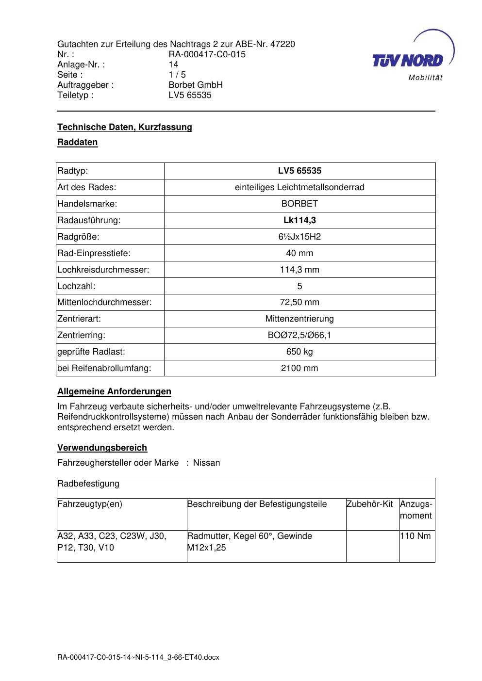 Dieses Gutachten (abe) bezieht sich auf die Alufelge brand-borbet LV5 65535 in der Ausführung ET 0, Mittenloch 0 mm (KBA 47220). Im PDF findest du typischerweise zulässige Reifengrößen, Auflagen/Anbauhinweise und – je nach Dokument – Hinweise zur Eintragung.