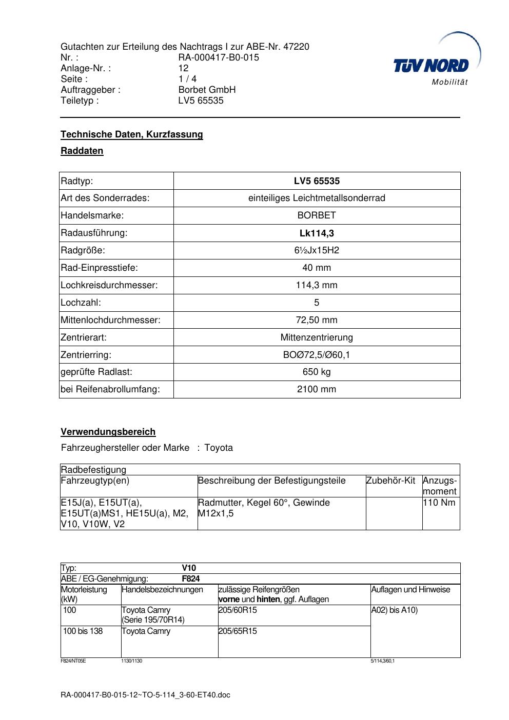 Dieses Gutachten (abe) bezieht sich auf die Alufelge brand-borbet LV5 65535 in der Ausführung ET 0, Mittenloch 0 mm (KBA 47220). Im PDF findest du typischerweise zulässige Reifengrößen, Auflagen/Anbauhinweise und – je nach Dokument – Hinweise zur Eintragung.