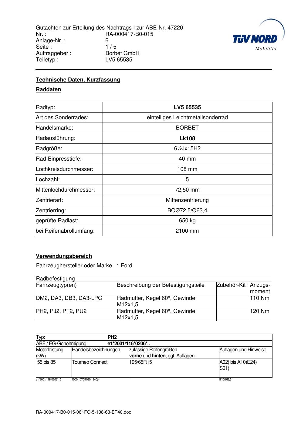 Dieses Gutachten (abe) bezieht sich auf die Alufelge brand-borbet LV5 65535 in der Ausführung ET 0, Mittenloch 0 mm (KBA 47220). Im PDF findest du typischerweise zulässige Reifengrößen, Auflagen/Anbauhinweise und – je nach Dokument – Hinweise zur Eintragung.