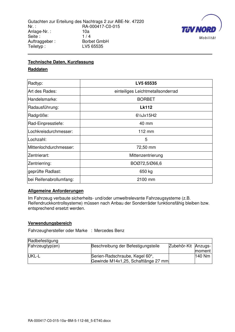 Dieses Gutachten (abe) bezieht sich auf die Alufelge brand-borbet LV5 65535 in der Ausführung ET 0, Mittenloch 0 mm (KBA 47220). Im PDF findest du typischerweise zulässige Reifengrößen, Auflagen/Anbauhinweise und – je nach Dokument – Hinweise zur Eintragung.