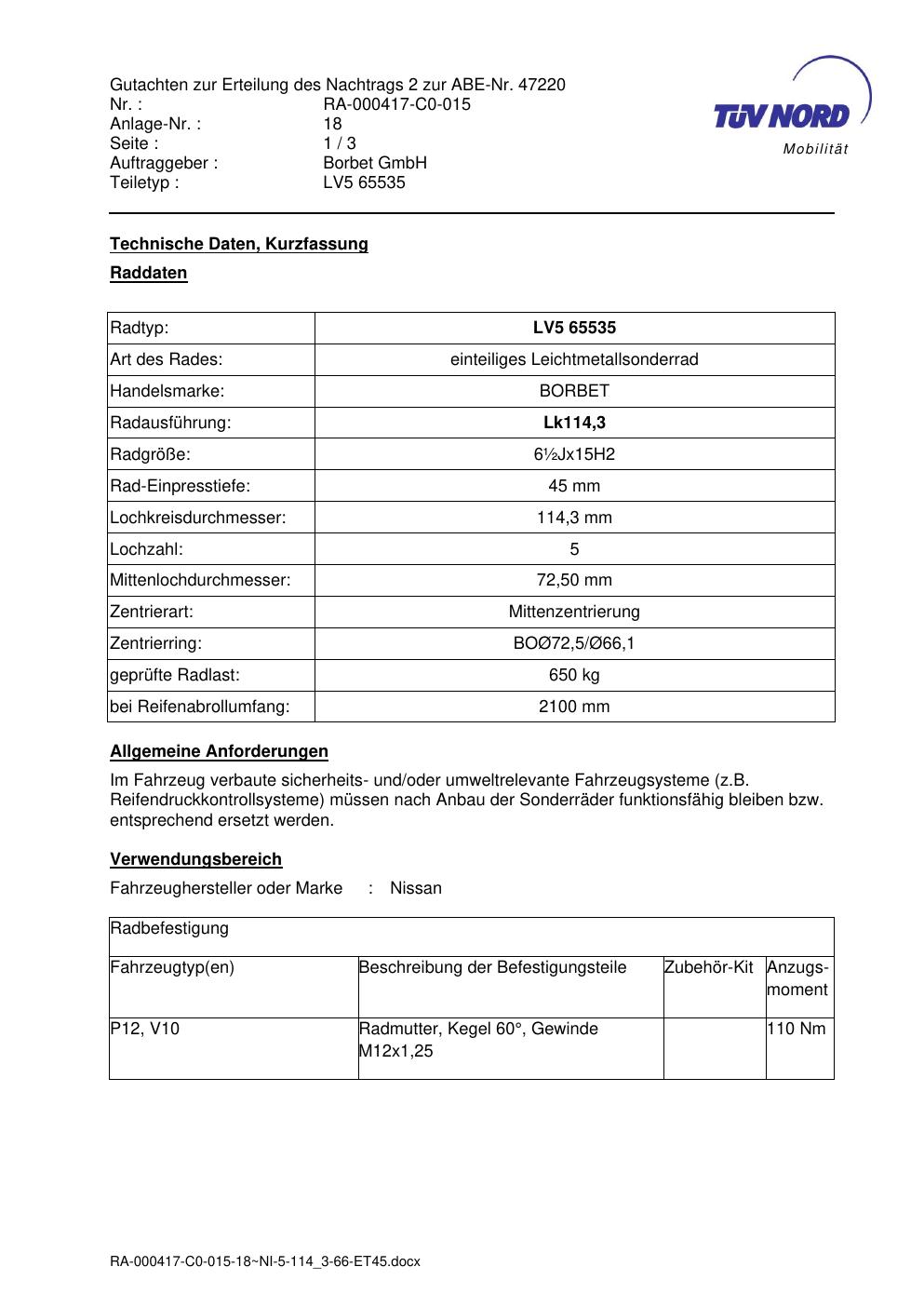 Dieses Gutachten (abe) bezieht sich auf die Alufelge brand-borbet LV5 65535 in der Ausführung ET 0, Mittenloch 0 mm (KBA 47220). Im PDF findest du typischerweise zulässige Reifengrößen, Auflagen/Anbauhinweise und – je nach Dokument – Hinweise zur Eintragung.