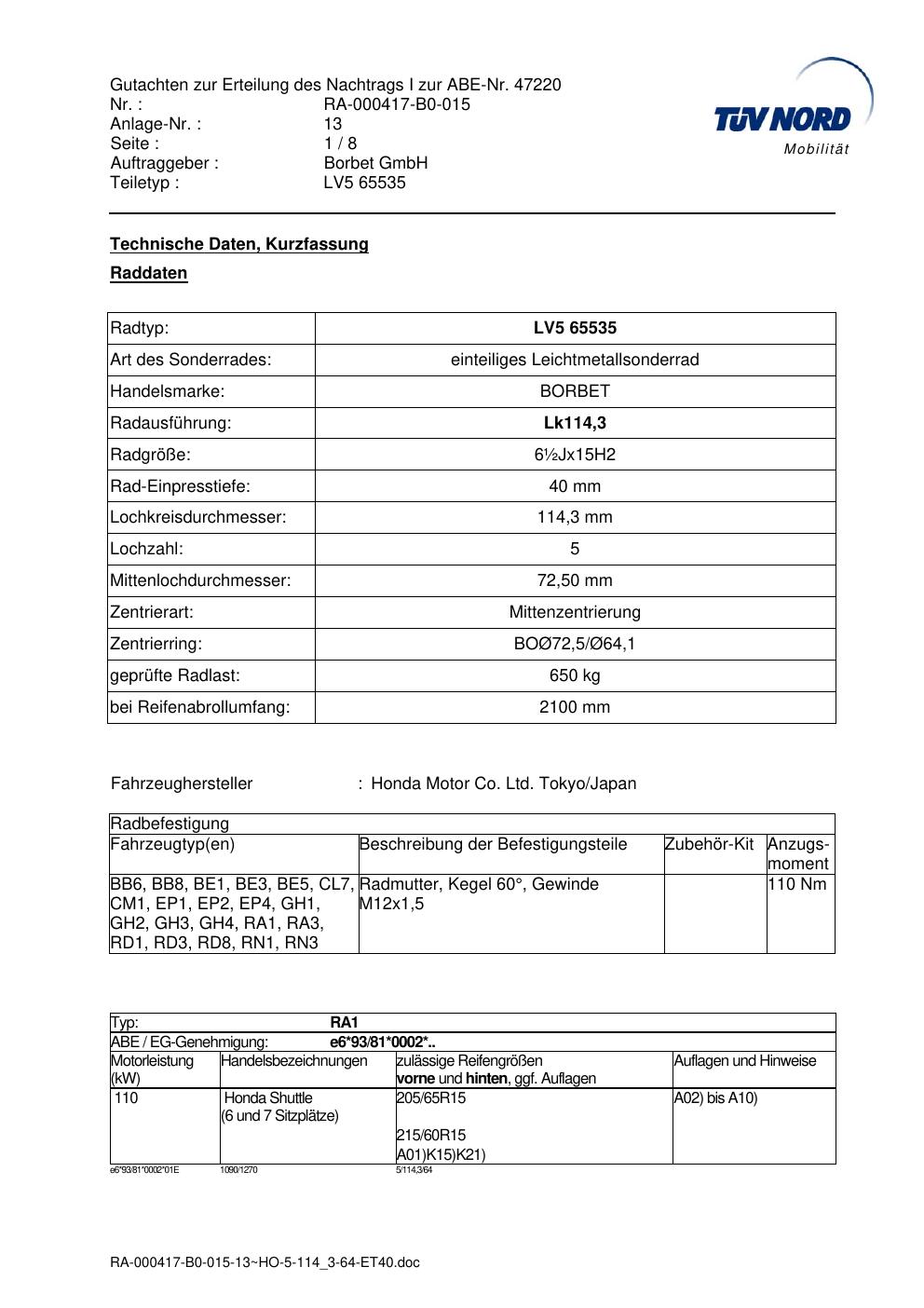 Dieses Gutachten (abe) bezieht sich auf die Alufelge brand-borbet LV5 65535 in der Ausführung ET 0, Mittenloch 0 mm (KBA 47220). Im PDF findest du typischerweise zulässige Reifengrößen, Auflagen/Anbauhinweise und – je nach Dokument – Hinweise zur Eintragung.