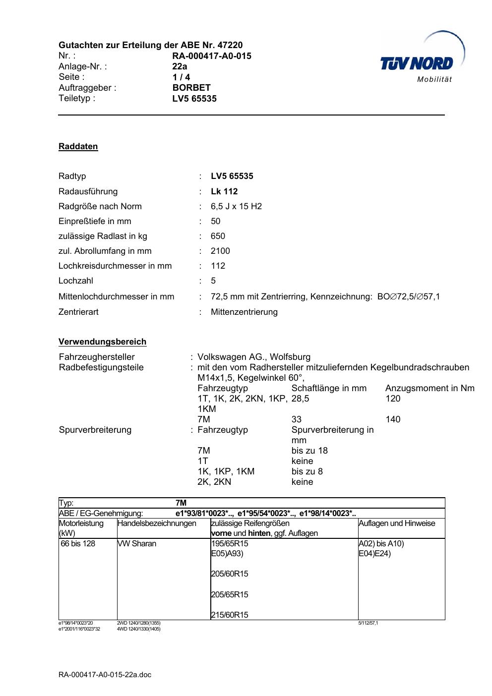 Dieses Gutachten (abe) bezieht sich auf die Alufelge Borbet LV5 65535 in der Ausführung 6.5Jx15 ET 0, Mittenloch 0 mm (KBA 47220). Im PDF findest du typischerweise zulässige Reifengrößen, Auflagen/Anbauhinweise und – je nach Dokument – Hinweise zur Eintragung.